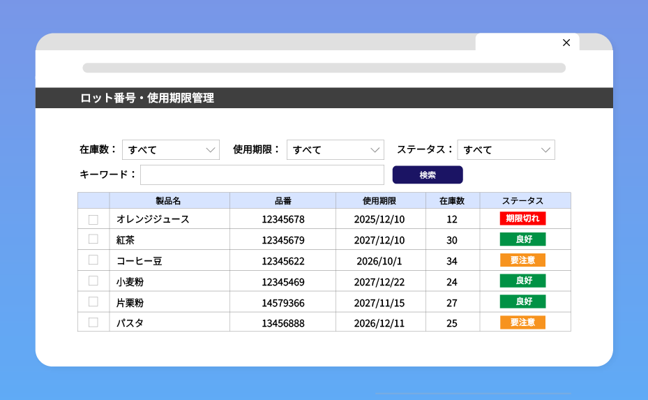商品マスタに「ロット番号」「賞味期限」を持たせ、出荷時に期限が近いものから先に出す(FIFO)機能。業界において最も恐れられる「期限切れ製品の使用」を回避しつつ、自動的に在庫引当、発注制御を可能にします。