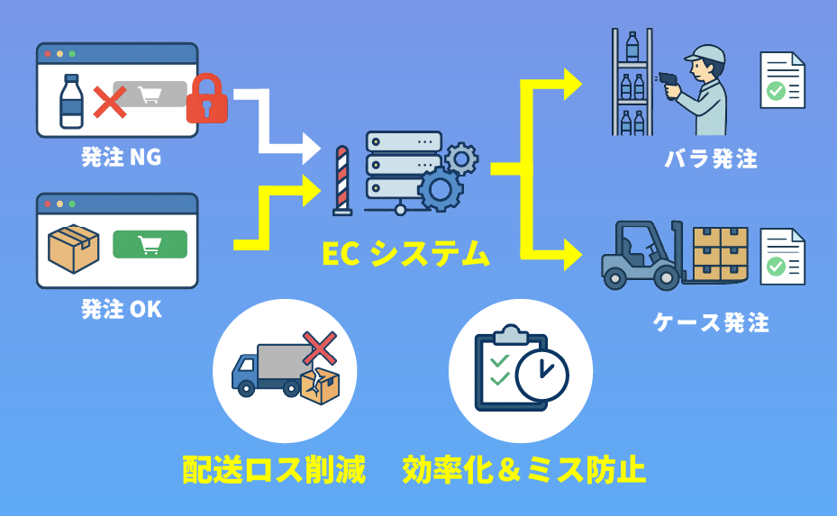 バラ発注にもケース発注にも対応し、バラ注文不可の商品にはロックをかける機能。誤発注における配送ロスの削減や、倉庫でのピッキング指示を明確にします。