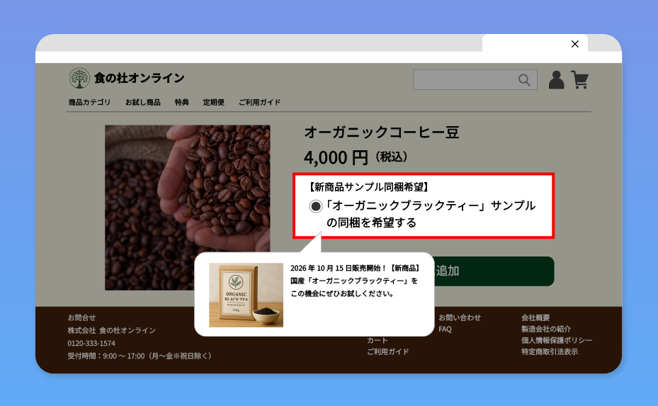 発注する際に無償のサンプル品や販促物(ポスター、成分表など)を同梱できる機能。従来のルートセールス担当が配っていた商習慣を自動化し、業務負荷を軽減します。
