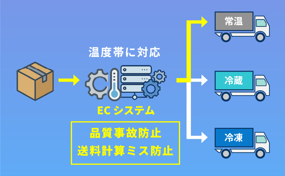 商品を「常温」「冷蔵」「冷凍」に仕分け、それぞれの温度帯に対応した送料計算や、混載不可の警告を行う機能。ユーザー側で温度帯を意識せずとも、発注時に正しく処理できるように対応し、品質事故や送料計算ミスを防ぎます。