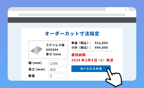 顧客指定の寸法・数量で受注できる機能。サイズ入力に応じて価格や納期を自動算出し、切断加工を含めたスムーズな受発注を実現します。