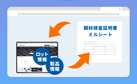 製品情報やロット情報と連動し、ミルシートを注文データに紐付ける機能。書類管理の手間を削減し、出荷時の証明書提出やトレーサビリティを確保します。